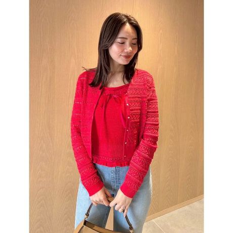 インナーの身頃は透けないメッシュ編みで編み上げ、襟元にリボンを通すなど、さまざまなきゅんとするデザインポイントを加えた、それぞれ単品でも気映えするアイテムです。
