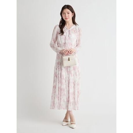 程よいボリュームのリボンで顔まわり華やかに。ウエストもシャーリングで伸縮性があり、被りでスムーズな着脱も可能。裾に施した2段プリーツはハリのある素材と相まって程よいシルエットを作り出し、間延びしないようプリーツの消し位置やスカートの切り替える高さなどバランスにもこだわりました。