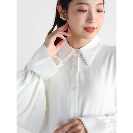 襟元と袖口にあしらったパール調の装飾が、さりげなく華やかさを添えるブラウス。