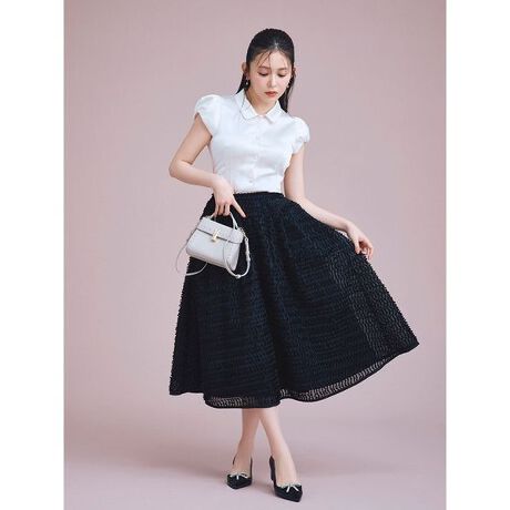 スカートを引き立てた、シンプルでコンパクトなトップス合わせのコーディネートがおすすめです。