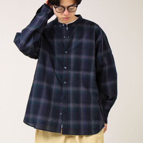 抜け感チェックで大人っぽい、軽やかバンドカラーシャツ