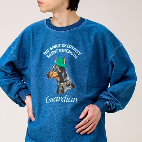 #FREDY&GLOSTER #GLOSTER #スウェット #カットデニム #デニム風 #プリントスウェット #アップリケ #ニットアップリケ #ドーベルマン #犬モチーフ #アニマルプリント #春トップス #ライトスウェット #ロンT感覚 #ユニセックス #大人カジュアル #ストリートコーデ #ゆるコーデ #ワイドパンツコーデ