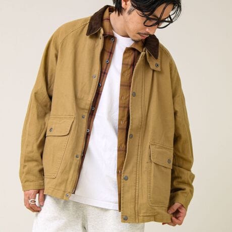 「衿コーデュロイが効いた、春のワークカバーオール」