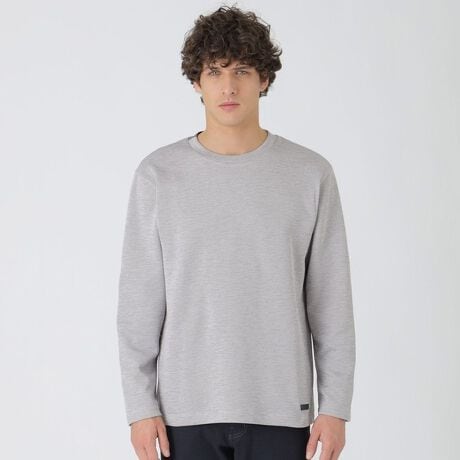 素材には表と裏の組織が異なるダブルフェイス生地を使用。表面をローゲージでざっくりとした表面感に、裏面をハイゲージで目を細かく編み上げた、クォーターゲージと呼ばれる生地を使用。ニットのような表面感がありながらも家庭洗濯可能で気軽に着回せる素材に仕上がっています。