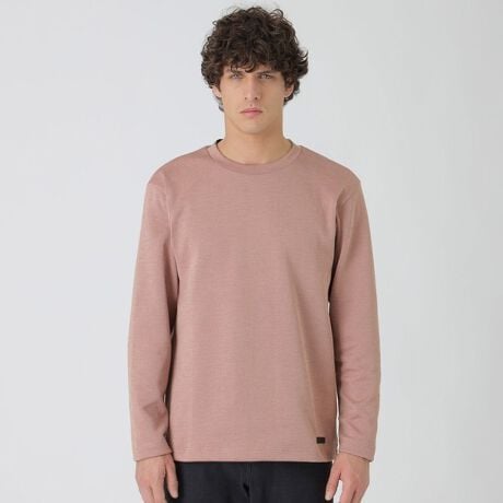 素材には表と裏の組織が異なるダブルフェイス生地を使用。表面をローゲージでざっくりとした表面感に、裏面をハイゲージで目を細かく編み上げた、クォーターゲージと呼ばれる生地を使用。ニットのような表面感がありながらも家庭洗濯可能で気軽に着回せる素材に仕上がっています。