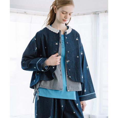 コットンツイルとデニムにオリジナルのフラワー刺繍を載せたテキスタイルで仕立てたジャケット。ロング丈のボトムスやワンピースなどに合わせやすいクロップド丈です。ドロップショルダーのゆとりのある袖回りで、スウェットやブラウスの上に羽織りやすく、前後差のある着丈とラウンドした裾のラインが柔らかな印象で着られます。袖口の配色パイピングがアクセント。