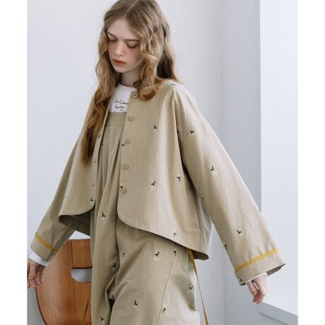 コットンツイルとデニムにオリジナルのフラワー刺繍を載せたテキスタイルで仕立てたジャケット。ロング丈のボトムスやワンピースなどに合わせやすいクロップド丈です。ドロップショルダーのゆとりのある袖回りで、スウェットやブラウスの上に羽織りやすく、前後差のある着丈とラウンドした裾のラインが柔らかな印象で着られます。袖口の配色パイピングがアクセント。
