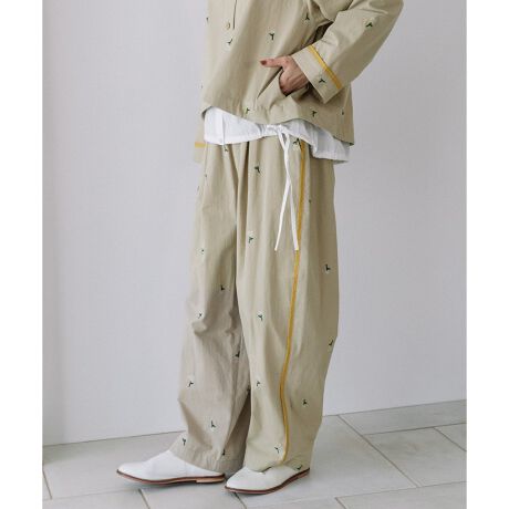 コットンツイルとデニムにオリジナルのフラワー刺繍を載せたテキスタイルで仕立てたパンツ。ウエストタックでヒップラインに丸みをもたせつつ、 裾にかけてやや絞ったシルエット。ほどよい厚みで、オールシーズン活躍してくれます。ウエストはぐるりゴム仕様、紐でサイズ感の調整も可能です。両サイドポケット付き。