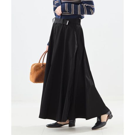 ウェストベルトのシルバー金具がポイントにもなるフレアロングスカート。