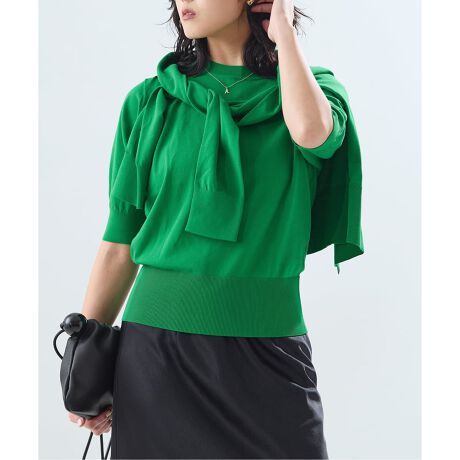 シンプルなハーフスリーブのニットプルオーバーはミニマムなサイズ感が上品な印象。