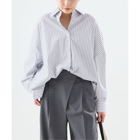 レギュラーカラーできっちりとした見た目にもかかわらず、ゆったりして涼し気なシャツはモードな印象。