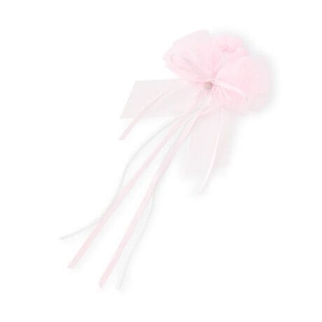 ボリュームのあるシャイニーなオーガンジーリボンのシュシュです。リボンの下バネやパールチェーンを長くデザインしたので動くたびに揺れ、ポニーテールのトップやハーフアップスタイルにつければ、後ろ姿も華やか。音楽発表会などの舞台上で目を引くアイテムです。