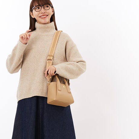 愛らしいミニサイズのトートバッグ。ロゴ入りのショルダーストラップがセットされた、便利な2WAY仕様です。しなやかさのあるフェイクレザーを使用し、フロントにはモノグラムロゴのメタルパーツをアクセントであしらいました。財布やスマートフォン、ポーチがすっきり収まり、最小限の荷物を持って出かけるときに重宝します。