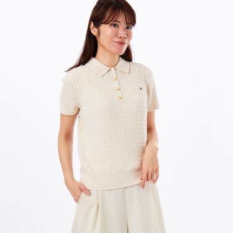 ミニケーブル柄のショートスリーブポロセーター。ファインゲージで丁寧に編み上げており、快適な着心地ながら端正な印象を与えます。左胸にはアクセントとなるフラッグロゴのワンポイントをプラス。体型を拾いすぎず且つスタイルよく着こなせるシルエットが、カジュアルシーンでも女性らしさを演出します。