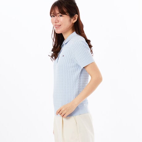 ミニケーブル柄のショートスリーブポロセーター。ファインゲージで丁寧に編み上げており、快適な着心地ながら端正な印象を与えます。左胸にはアクセントとなるフラッグロゴのワンポイントをプラス。体型を拾いすぎず且つスタイルよく着こなせるシルエットが、カジュアルシーンでも女性らしさを演出します。