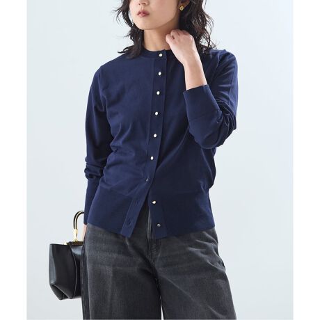 シンプルながら、ゴールドボタンが上品な印象のクルーネックカーディガン。