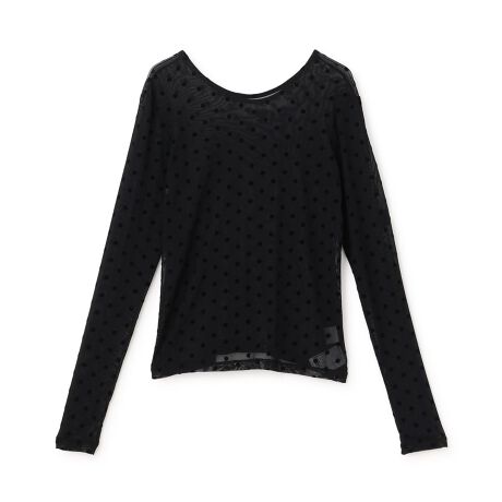 軽やかなシアー素材にドット柄をあしらった、2WAY仕様のトップスです。前後どちらでも着られるデザインで、気分やコーディネートに合わせてアレンジできます。単品使いはもちろん、ベストやスカジャンのレイヤードとしても活躍する一枚です。