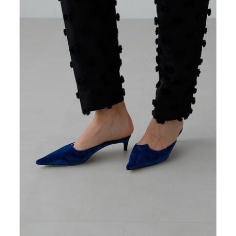 アッパーは甲をあまり覆わないマチュアなカッティングでキトゥンヒールのベロア素材のミュール。