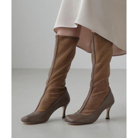 カラーもあえてブラックではなくトープの様なベージュカラーをいれ、ブーツだけどヌーディで軽さのある足元を作ります。メッシュがソフトなのでクシュっとたるませてる履き方もおすすめです。