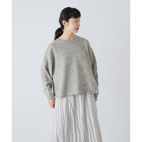 テープヤーンで編み立てたコットンニットが届きました。日々のコーデに取り入れやすくスタイリングに重宝するアイテム。季節を問わない風合いはロングシーズン活躍の予感です。衿ぐりはスッキリとしたボートネックを採用。女性らしい品の良さがあり、首元のシルエットを美しく演出します。程よくゆとりのあるシルエットがストレスフリーな着心地です。奥行きを感じるメランジのカラーも魅力的。同素材のベストもぜひご覧ください。