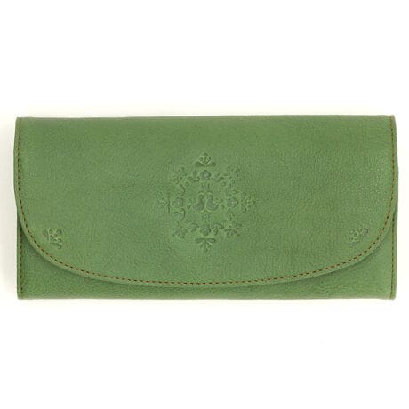 [型番:332461]ナチュラルな牛革に小鳥とお花モチーフの模様がかわいいお財布です。収納力がありながらも、「かるい革のお財布」に仕立てました。
