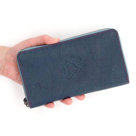 [型番:332463]ナチュラルな牛革に小鳥とお花モチーフの模様がかわいいお財布です。収納力がありながらも、「かるい革のお財布」に仕立てました。