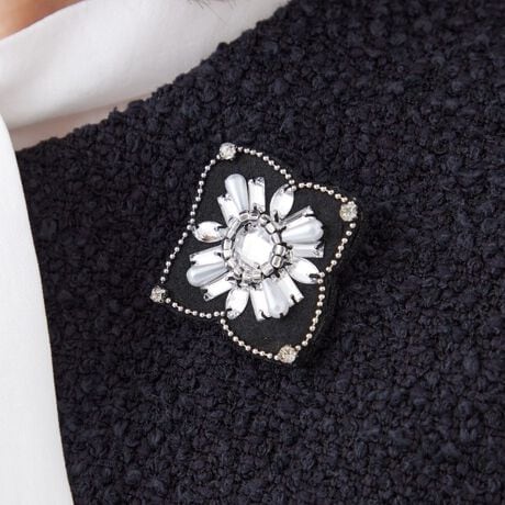 中央には、パールやガラスビーズ、アクリルパールをあしらい、アウターやトップス、ストールまで幅広く付けられるようなデザインにしました。