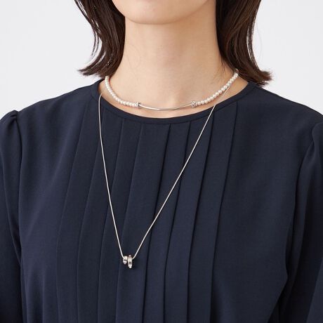 [型番:U1V03701__]ショートのガラスパールネックレスとロングのモチーフ付きネックレスの3WAYタイプです。首回りだけにポイントを置きたい時はパールを。V開きのスタイルにはパールとロングをと使い分けができるネックレスです。