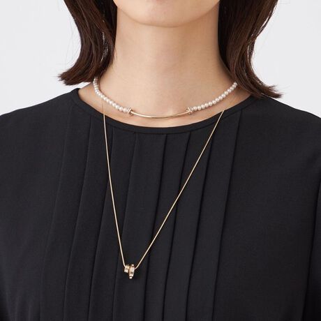 [型番:U1V03701__]ショートのガラスパールネックレスとロングのモチーフ付きネックレスの3WAYタイプです。首回りだけにポイントを置きたい時はパールを。V開きのスタイルにはパールとロングをと使い分けができるネックレスです。