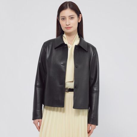 上品な印象に仕上げたステンカラーのレザージャケットです。