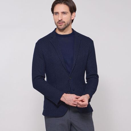見た目はテーラードジャケットのように端正でありながら、着心地はカーディガン感覚で羽織れるニットジャケットです。極力芯地を使わず、編地特有の伸縮性を生かした仕様にしています。裏地は袖裏のみですので、初夏まで長い期間活躍するアイテムです。シングルブレステッド2ボタン、ノーベント、筒袖(袖釦なし)、フラップポケットのデザインです。