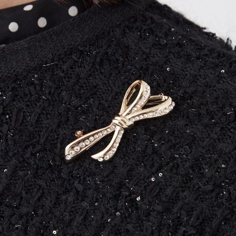 [型番:U1V02700__]立体的なタテ型のリボンモチーフに大きさをグラデーションにしたガラスをあしらい、高級感あるブローチにしました。オケージョンはもちろん、コートやニットに合わせて華やかさをプラスできるブローチです。