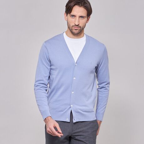 ベーシックなデザインの前開き釦カーディガンはテーラードの考えを取り入れ、立体的に設計しています。身体の形状に合わせてパターン形状、分量感を細かく調整することでシルエット、着用感が大幅にアップデートされました。肩の接ぎの縫い目をゼロにする特殊な縫製仕様など、パターンと合わせて細部まで、着用感に拘りました。左胸にダンディマンの刺繍を施しています。