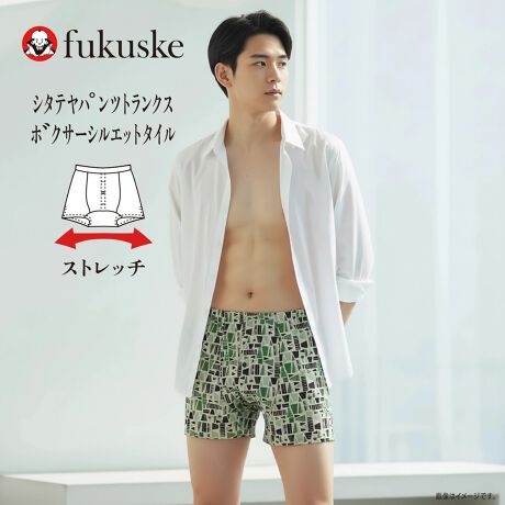 創業百四十余年の福助が、長年の経験を活かして丁寧に仕立てた、こだわり満載の一枚です。「仕立てのこだわり」が隅々まで息づいています。柄は、モダンで洗練されたタイル柄プリントを採用。トランクス特有の解放感はそのままに、気になる見た目もスッキリと見えるボクサーブリーフのようなシルエットを実現しました。素材には、布帛(織物)でありながら、驚くほどの伸縮性を持つストレッチ布生地を使用しています。このストレッチ性が、体の動きに合わせて優しくフィットするため、トランクスにありがちなゴワつきや突っ張り感を解消します。さらに、トランクスの形状をより身体に馴染ませる3Dパターン(立体設計)を採用し、着用時のフィット感を高めています。また、股下部分にはサイドスリットを設けることで、足さばきが良く、動作もスムーズです。年中感じる蒸れ感に対応できるよう、素材と設計に配慮しており、肌への刺激が少ないなめらかな生地のウエストゴムと相まって、快適さが続きます。伝統技術と現代の機能性が融合した、特別なトランクスをぜひご体感ください。