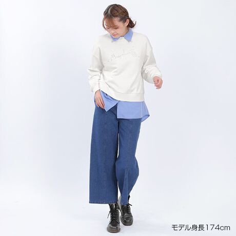 ベーシックなサイズ感の裏毛プルオーバー。◆ポイント・熱圧着(ホットフィックス)したラインストーンでサインロゴを表現・ロゴまわりにも大小のラインストーンが散りばめられたデザイン・しっかりした素材・少し短めの丈感・長袖◆コーディネートカジュアルなスウェットもラインストーンで上品さをプラス。幅広いスタイリングが楽しめます。[型番:225-604804]