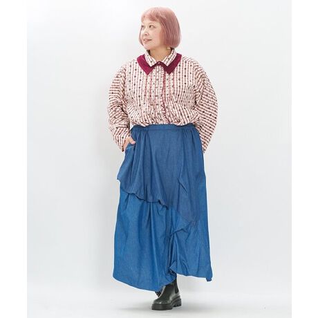 2色のデニムを贅沢に使い、切替とタックで立体感を生み出した存在感たっぷりのスカートです。