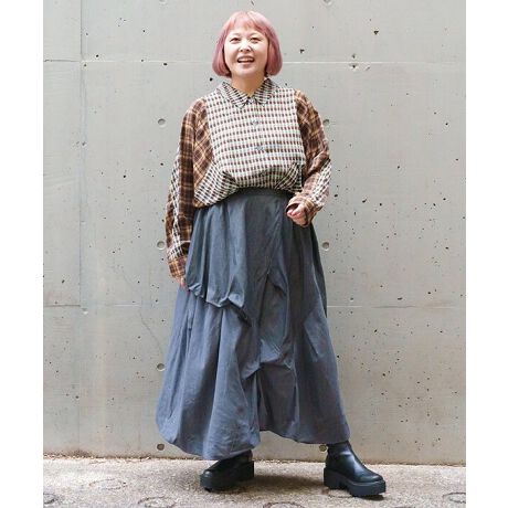 2色のデニムを贅沢に使い、切替とタックで立体感を生み出した存在感たっぷりのスカートです。