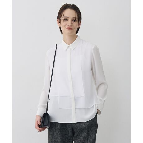 ■デザイン別布ジョーゼットを重ねたデザイン性の高いシャツブラウスです。ジャケットや羽織のインナーでも着映えるデザインで、ベーシックながらスタイリッシュな印象に仕上げています。別布部分は薄手のジョーゼットを使用している為、軽い印象に仕上げている所もポイントです。