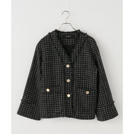 クラシカルなツイード素材に、切りっぱなしのフリンジディテールで抜け感をプラスしたノーカラージャケット。 フロントとポケットにあしらわれたゴールドボタンが上品なアクセントに。