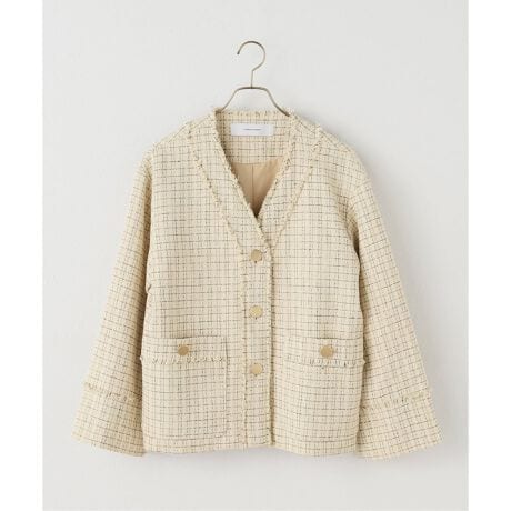 クラシカルなツイード素材に、切りっぱなしのフリンジディテールで抜け感をプラスしたノーカラージャケット。 フロントとポケットにあしらわれたゴールドボタンが上品なアクセントに。