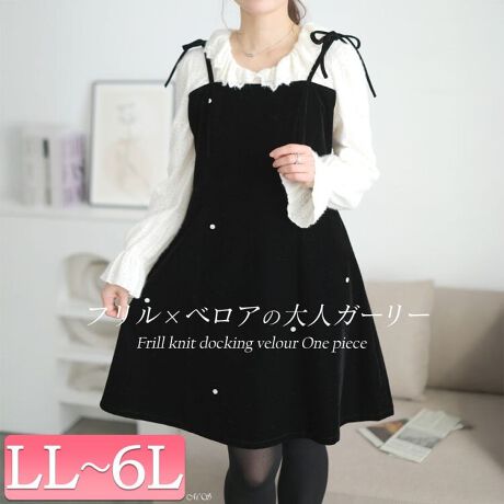 【大きいサイズ】 フリルニットドッキングベロアワンピース 大きいサイズ レディース ワンピース 長袖