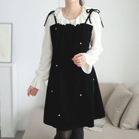 起毛感のあるニットと上品なベロア素材を組み合わせたドッキングベロアワンピース。フリルネックとキャンディースリーブが顔まわりに華やぎをプラス。高めの切替えと肩紐が自然に視線を上へと向けてスタイルアップ。くびれを意識したXラインと程よいゆとりのあるサイズ感が全身のバランスを整えます。ブラックベロアにランダムにあしらわれたビジューが甘さの中に大人っぽさをプラス。デートや女子会、おでかけなど特別感を出したい日におすすめ。着るだけで可愛い雰囲気アップ、気分も華やげてる一着です。