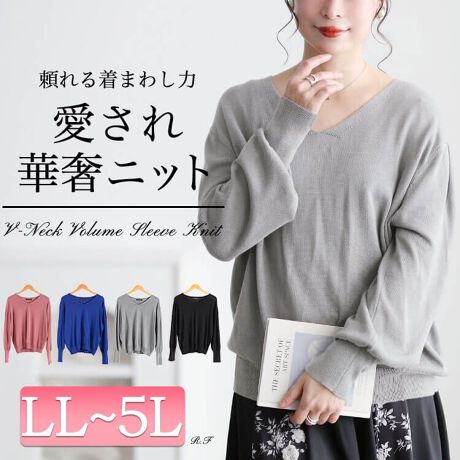 【大きいサイズ】 Vネックボリューム袖ハイゲージニット 大きいサイズ レディース トップス ニット
