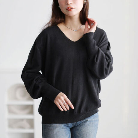 愛され華奢感をつくりだすVネックボリューム袖ハイゲージニット。オンオフ使えて着まわし力抜群のシンプルさ◎体型を拾わない身幅、ゆとりのある脇ぐり・ぽわん袖で窮屈感なく着用していただけます♪ぼわんっとした丸みが愛らしいボリューム袖がシンプルな装いに女性らしさを演出◎袖山のタックデザインが立体感をつくり自然に二の腕をカバー☆袖口と裾の切り替えが装いにメリハリをつけ着こなしをワンランクUPしてくれます!