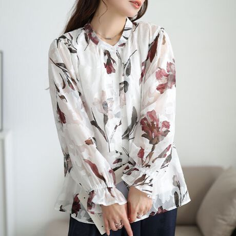 品の良い花柄プリントに、さらに花柄ジャガードを重ねることで、立体感を生み、特別な存在感を放つ一着。キャンディースリーブが甘さをプラスし、スタンドネックに仕上げることで、きちんと感はそのままに、程よいカジュアルらしさをプラス。シアー素材でインナーとの相性も楽しめます。リラクシーなバスト設定でボディラインを拾わず、ゆったりぽわんとしたキャンディースリーブは、レディ感を高めつつ、二の腕や手首を華奢見えに。首元のタックで見た目以上のゆったり感を演出し、長過ぎず短過ぎない絶妙丈でアウトしてもサマ見えに。