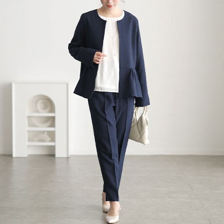 れいめセットアップとして活躍する、ジャケット&ブラウス&テーパードパンツ。学校行事やオケージョン、通勤まで幅広く使える頼れるアイテム。ノーカラーのすっきりジャケットはふわっと広がるペプラムデザイン。ウエストを高く見せて、ふわっとしたシルエットでお腹やおしりをカバー。ネックレスが付属しているシフォンブラウスはとろみ感ある素材で上品な印象へ。タック入りですらっと見せてくれる細見えがポイント。ウエストゴムのテーパードパンツはセンターライン入りで簡単に美脚見せ。単品でも使いやすく、どんなコーデにも万能。学校行事、オフィスカジュアル、きれいめなお出かけまで対応。大人の女性の日常に寄り添う安心感と実用性を兼ね備えたおすすめのセットアップですよ☆