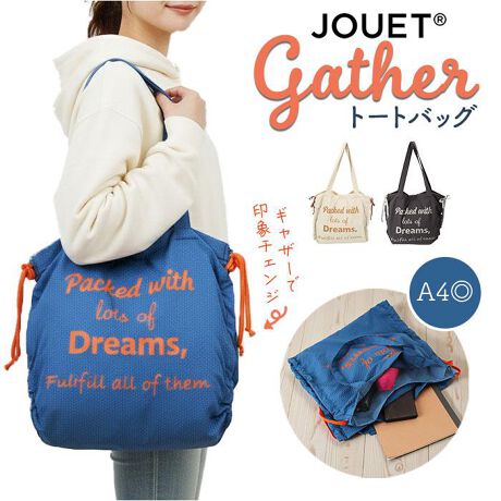【大人女子に人気】「JOUET-ジョエット-」から、「ギャザーあおりトート」が新登場。【フォルムチェンジが可能】サイドのリボンでギャザーを調節すればバッグのフォルムを簡単に変えられる◎【3層の仕切りで収納上手】A4がすっぽり入るスペース×2、スマホやパスケースの収納にぴったりなスペース×1の3ルーム構造。【見た目以上の収納力】荷物が多い日のデイリー使いはもちろん、幅広いシーンで使える実力派。【開閉らくらく】開口部はフラップボタンでパチンと留めるだけの簡単仕様。【軽やかで持ちやすい】軽量設計で肩掛けも快適♪ギャザーデザインがおしゃれなトートバッグ。