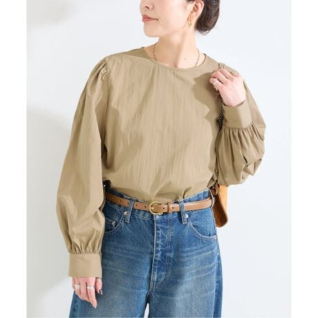 シワが気になりにくいシボ感のある素材のゆとりあるシルエットが魅力。肩にギャザーを入れた少し膨らみのあるショルダー、袖口にもたっぷりボリュームがくるようにギャザーを寄せたスリーブデザインになっています。バックスタイルは釦開きで、オフィススタイルにもぴったりな落ち着いた雰囲気のアイテム。