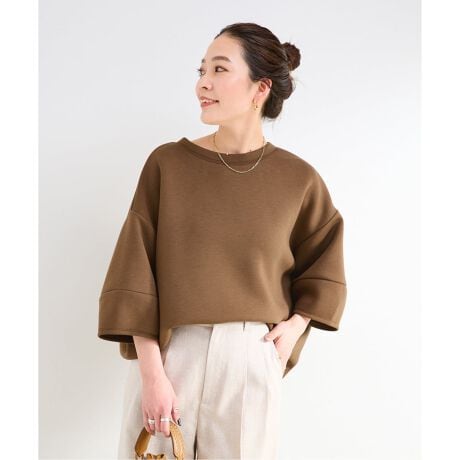 着心地:肘が隠れる袖丈ですが素材感軽く、肌離れしたフォルムなので涼しく着られます。ゆとりがあるので寒い時期には重ね着しやすいシルエットで、切り替えによって立体感のあるシルエットが魅力です。