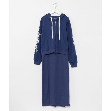 [型番:4CA-6147-2026]短丈のジップパーカーとリブワンピースのセットアップ。パーカーは柔らかな裏毛素材、ワンピースは伸縮性のあるリブ素材で動きやすく、スタイルアップ効果も◎。ワンピースのフロントにはワンポイント刺しゅう入り。コーディネートしやすいWジップ仕様です。パーカーとワンピースのセット商品